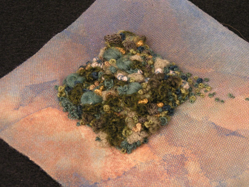 Last week we talked about visual texture and using pattern in your work to achieve texture on a 2D surface. Today we’re going to talk about tactile texture. This is what I love in fiber art. All that fiber and woolie goodness. This is a French Knot sample that I did for my Level 1 Hand Stitch class. We were supposed to do a square that was 1 1/2″ x 1 1/2″ filled with French knots and “messy” French knots. Mine overflowed a bit. But I had the best time making some of the biggest French knots I’ve ever made from yarn. You can see from this shot that it looks almost like the stitches have been padded underneath. They haven’t. It’s all knots. Now this is my kind of texture.