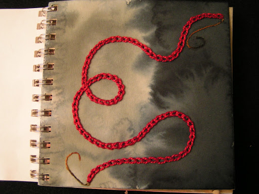 This is one of my pages from our stitch sketchbook. I had never hand stitched on paper before and sometimes felt like I was in Occupational Therapy but I found it enjoyable. Don’t you like the texture of the chain stitch sitting on the surface of the paper? I’m working on more stitches to go into the book and I’ll show you the entire book later when it’s finished. The page is painted with Procion MX dyes. We painted the pages with the same dyes that we used to dye our threads.
