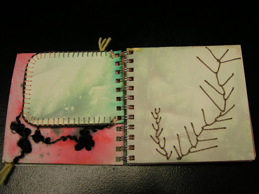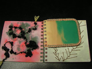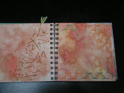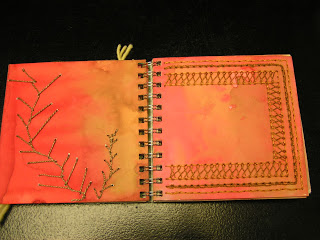 The page on the right has herringbone stitch. I still have to do a “knotted” page for homework. I think I will be using one of the black/grey backgrounds with some of my orange hand dyed threads to resemble a lichen photo that I have. There are still 8 pages that are blank so if you have a suggestion for a stitch that I haven’t done and would work well through punched holes, let me know.