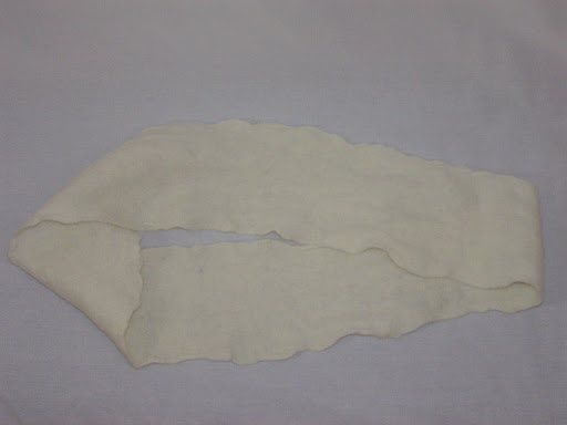 So how many of you remember what a Mobius strip is? The definition on Wikipedia says that it is a surface with only one side and only one boundary component. Essentially is is a circle of something flat with a twist in it. I had seen Mobius knitted scarves but when Zed challenged us to make something with a twist, curls or swirls, I thought I should try a felted Mobius scarf. Sorry that it isn’t the best of photos. I took it last night and photos of white felt objects are really hard for me. I started this scarf at our felting party and finished it at home. I wasn’t sure it was going to work out but I actually like it and I may even wear it. I hardly ever wear anything that I make so that would be a change. It is made from the local merino I bought and is really fairly light and airy. I can’t decide whether I should dye it or leave it white. What do you think?