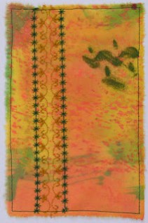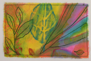 I just looked at the piece to find a place to start. The green paint on the left looked like leaves so I thread sketched those in and sketched in longer leaves on the right. I used stitch and tear to stabilize the fabric. I found it worked best if I fused the stitch and tear and the fabric before stitching. I then fused the stitched fabric to the card before sewing around the edge.
