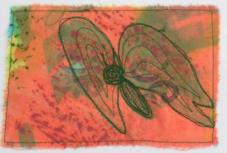 I saw a butterfly in this piece of painted fabric. He’s a bit wonky but still looks like some sort of flying insect. Each card only takes about 10 minutes or so. I’m going to try and stitch a few every day so I have cards to use when I need them.