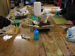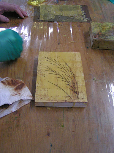 I met with my local fiber group today and we played with beeswax and encaustic techniques. I had never tried this before and it was pretty interesting how the layers of wax and oil paint work together.