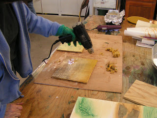 You can then heat the wax again with a heat gun or a blow torch to move the wax and paint around. You keep adding layers of wax and paint. You can also collage in a variety of things such as papers. We used yellow beeswax so the results are on the yellow to orange side.