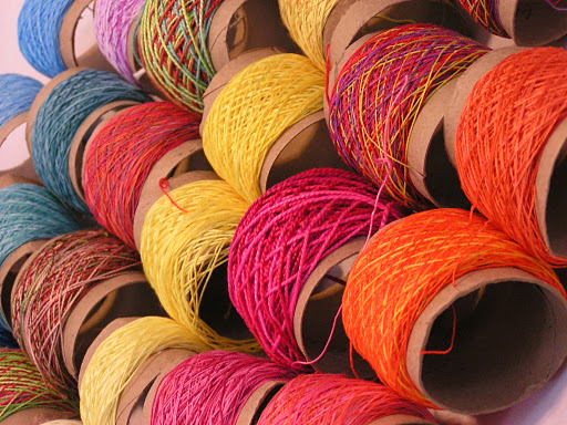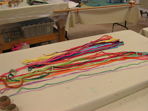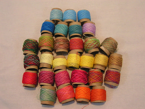 Here are all the threads I dyed on their cardboard tubes. I finished winding them at home. We used all cotton threads in a variety of weights.