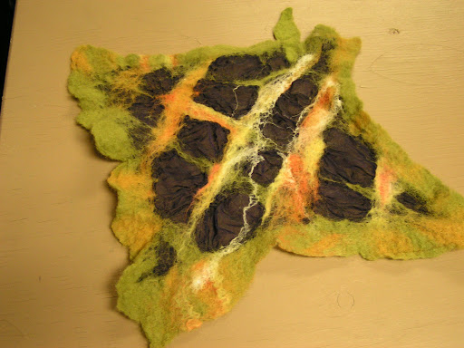 This one is Diana’s sample. She is planning on dyeing her jacket after it is felted. She used a yellow piece of silk but will be using white on her jacket.