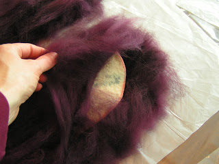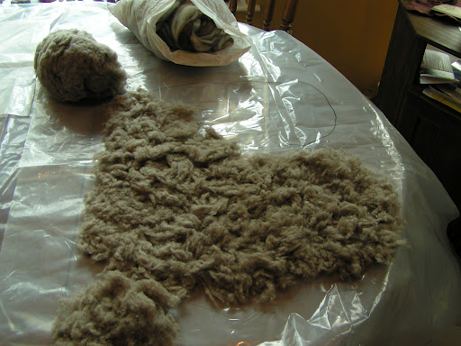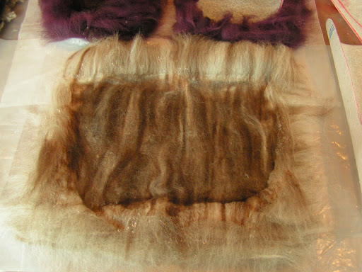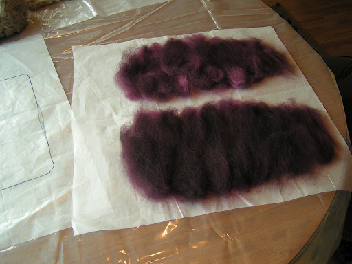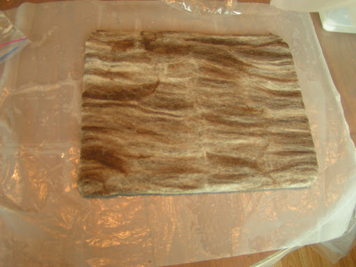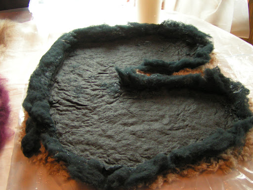 My sister Margaret is visiting me for a week and we decided to felt some slippers yesterday. She hasn’t felted before so this was her first effort. The photo above is the layout for slippers for my husband. I used some fiber that a friend gave to me. It is the broken tips from a merino fleece. They can’t be carded because they are too short. It was a pain to lay out but actually worked out better than expected. I made the slippers really thick because hubby wore through the last pair very quickly.