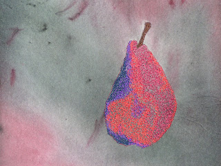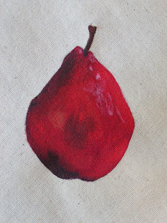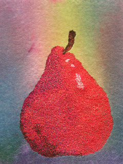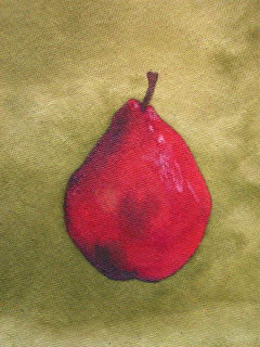 This is the finished pear. Looking at it now, I think the shadows on the bottom are a bit dark. But that just might be because there are no corresponding shadows on the ground section. I just embroidered the pear and not the background. I got a lot of distortion of the background which is a heavy weight Pellon.