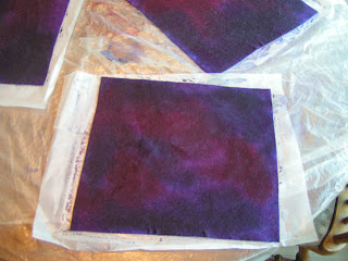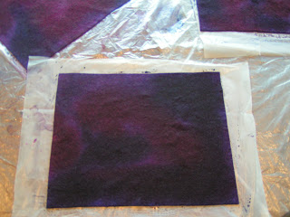 I needed to dye some 30/70 wool/rayon felt for my upcoming stitch class. My initial plan was to dye a rich chocolate brown. We will be using the felt to make beaded books and I was planning on using gold beads. Luckily, I remembered that this type of felt loses a lot of color when dying with Procion dyes and the brown might not have been recognizable. So I decided to go with red violet and violet.