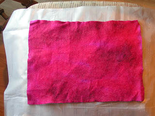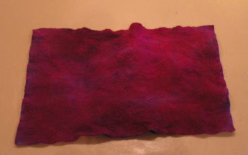 I am still unhappy with the result. It is a bit more purple but closer to maroon. At least it’s not pink. I may have to resort to Dye-Na-Flow paint if I really want purple. I still have to fuse a layer of organza to the surface so perhaps I’ll go with a really dark organza and that will solve the problem. My hands are all blue but the felt isn’t, sigh.