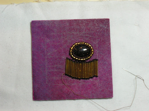 This is the basic cabochon bead attachment. There are two rows of beads around the cabochon. You can enlarge the photo to see it better. Now I am working on adding the bugle bead row. It is hard to get the bugle beads aligned exactly. But with practice I am getting slightly better at it. I’m off to stitch a few more beads down. Have a good evening and thanks for stopping by.