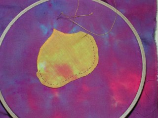 The last thing I worked on today is this needleturn applique of an aspen leaf. It is sort of tedious work and stitching the felt applique is considerably easier. But I’m making progress despite leaving a big loop of thread on the back of the fabric, tying a knot in the working thread and then breaking the thread in mid stitch. But I will persevere!