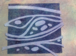 Here’s the piece after I basted the organza in place. I will then stitch it down at the edges of the white felt.