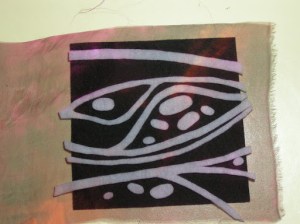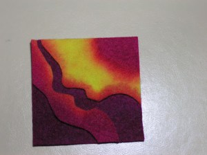 Since it is going to be a “shadow” applique, I tried out various pieces of silk organza to cover the felt.