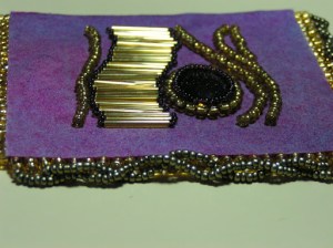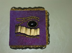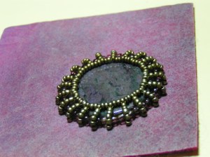 Then I stitched down the cabochon on the front page. I’ve got to decide if I want to add more to the front page or just add the edge. It would be pretty plain but the book is really getting heavy. I’m not sure I should add much more.