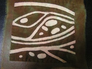 This is the shadow applique. It’s made with black and white felt and then covered with a layer of organza and then stitched to hold the felt pieces in place. You can’t really see the stitching well but if you click on the photo you should be able to see it better. I used black thread so it would give the “shadow” effect. I just need to finish the edges and turn the organza under to finish the edge. I hope to get my bead book ready to bind tomorrow. I have to find something that will hold it fairly straight while I stitch. Hopefully, I’ll be showing you a finished bead book soon!
