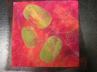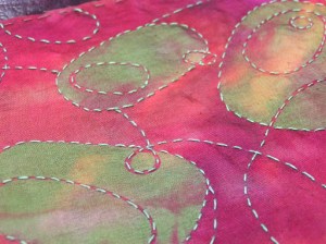 Here is the finished applique. You can just barely see the silk organza sticking out around the edges. I need to fold that over and fuse it to the back and then stitch around the edge. I think I will stitch the edge in a reddish brown so that it doesn’t show much. I don’t think I want to stitch it in green.