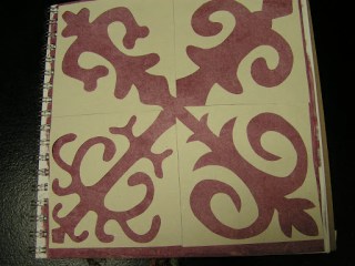 Here are four other design possibilities. These are all based on “ram’s horns” and from photos I found online of various shyrdak. I cut the patterns out from paper and glued them down in my journal. There are endless variations. I think I might just do one of the emblems instead of four connecting ones on a four inch square of felt. But perhaps I’ll go for it and do all four squares.