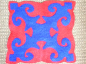 Here’s the applique all stitched down. What color cording do you think I should use? Usually another color is used in the traditional Kyrzyg appliques. I was thinking maybe green?