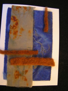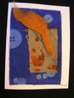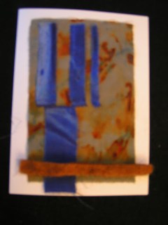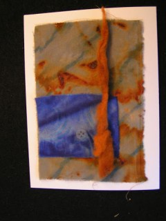 This is the first card. I used some fabric that was rusted and then shibori dyed. The blue fabric is a batik that has been painted and sun printed.