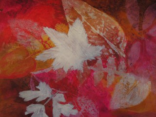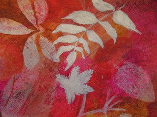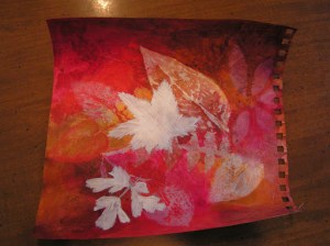 I had to get up early this morning for an appointment so I had a spare 45 minutes before I needed to go to work. I spent that time painting another layer on my leaf painting experiment. I also finished a second fabric collage for a card.