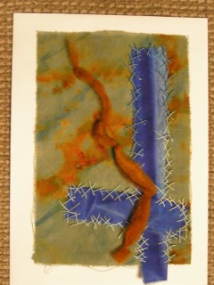 Here’s the next fabric collage card. I used herringbone stitch to applique the blue pieces to the background.
