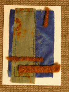 This one I spent a bit more time one. I used chain stitch on the blue fabric following the outlines that were already on the fabric from sun printing. Then I used blanket stitch on one edge of the felt. I’ve decided that I am going to fuse these down to the card stock so there won’t be any additional stitching.