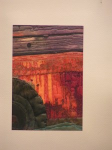 This is another print to stitch piece. I was surprised that this light gray was the best color matting for this piece. The black just kind of sucked the color out of it. One of the things we worked on in class this time is deciding what value matting to use with each piece.