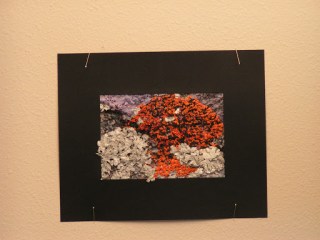 Here is my print to stitch lichen in it’s matting. That orange really pops against the black, doesn’t it?