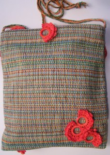 Here you can see the weave, it’s got great colors and the crocheted bits really bring out the orange lines. Now to see if it will sell. I have at least 5-6 more of these bags, not all the same shape and colors but if this works, I may embellish the others as well.