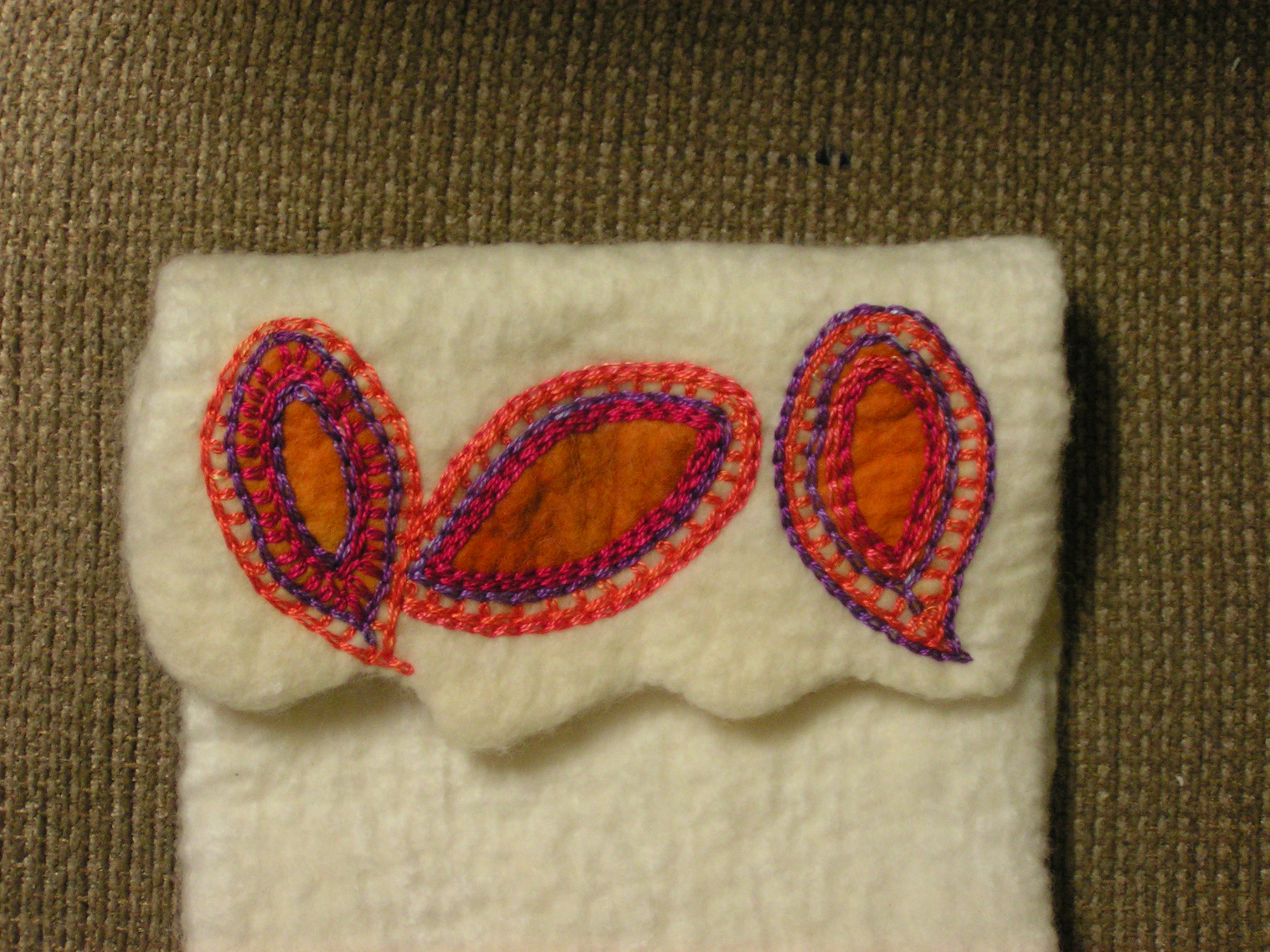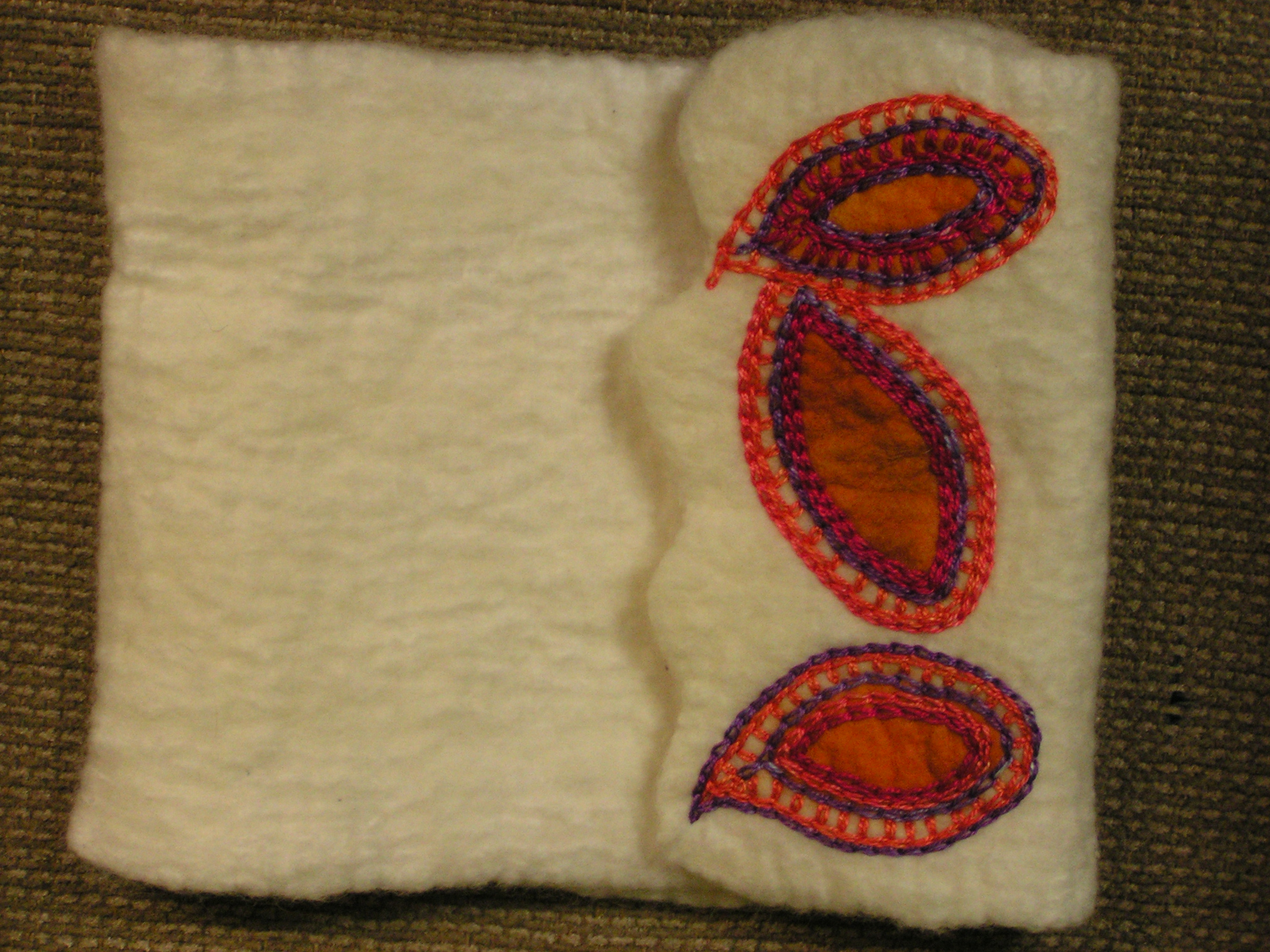 I have been stitching on the paisley book cover and I’ve made a fair amount of progress. That’s mainly because I’m doing chain stitch which is fast and using #5 perle cotton. The heavier thread makes a bigger statement and it really works well on felt.  Smaller stitches and thread tend to sink in and disappear.