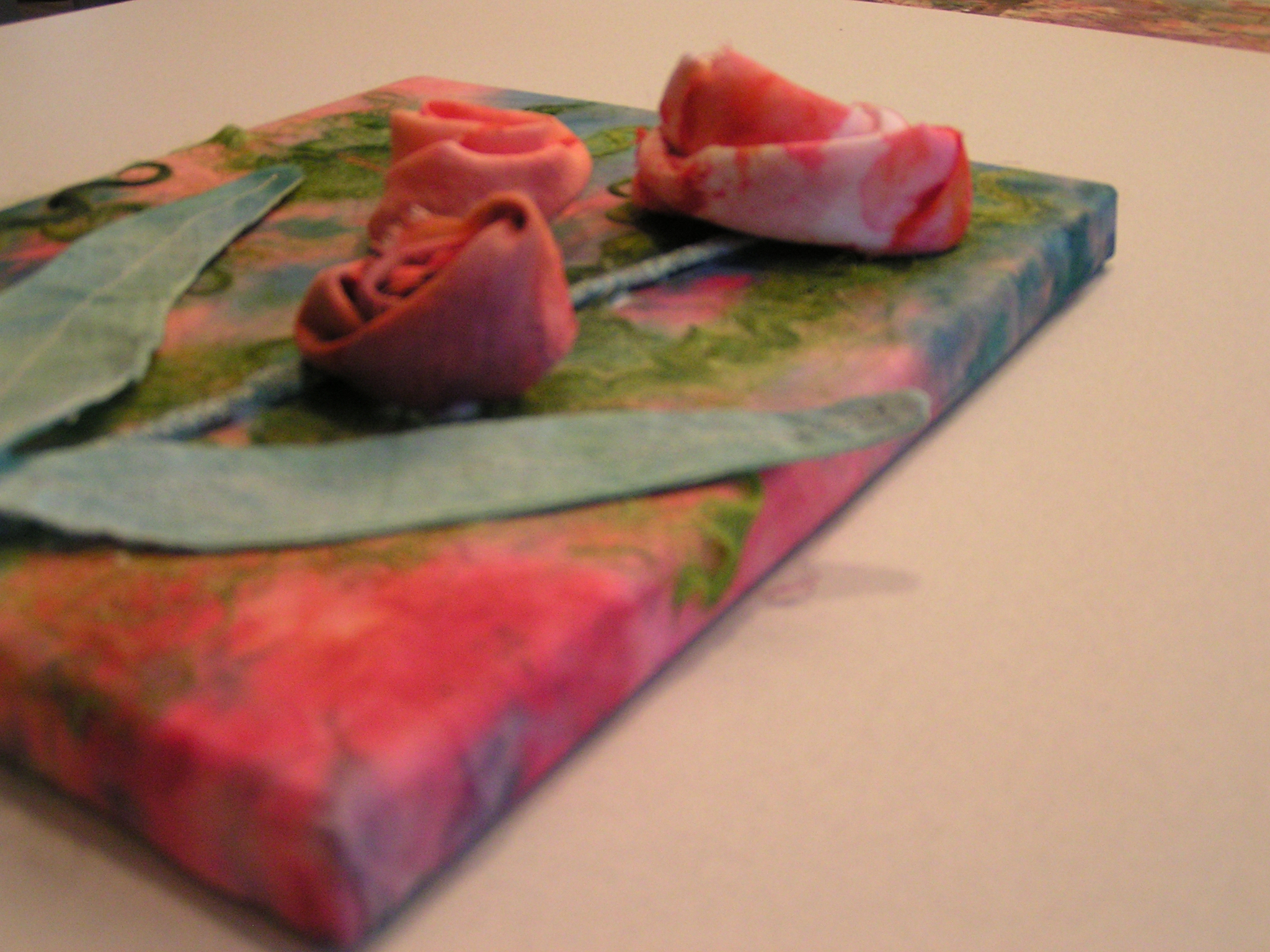 I then took painted fabric and made a few rolled roses. These are simple to make, just wind up the fabric and then stitch through the back to hold them together.