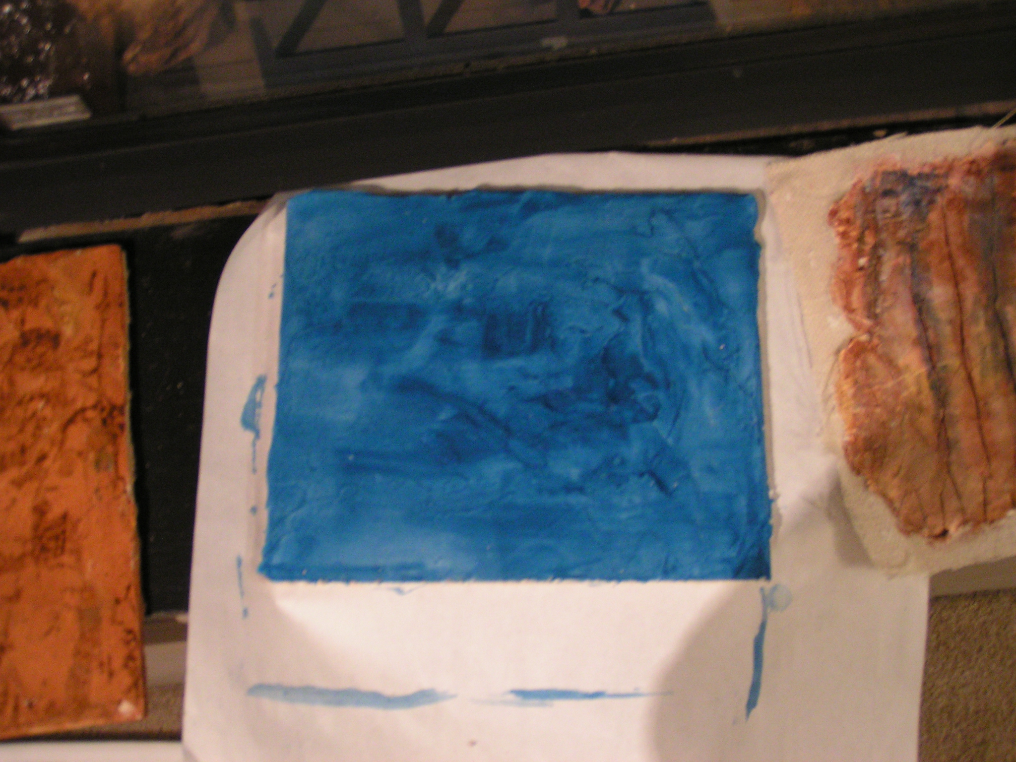 Base Coat of Paint on Plaster BoardThe blue one in the middle is plaster on a ceiling tile – it is drying. I thought I would try a gel medium transfer on this one.