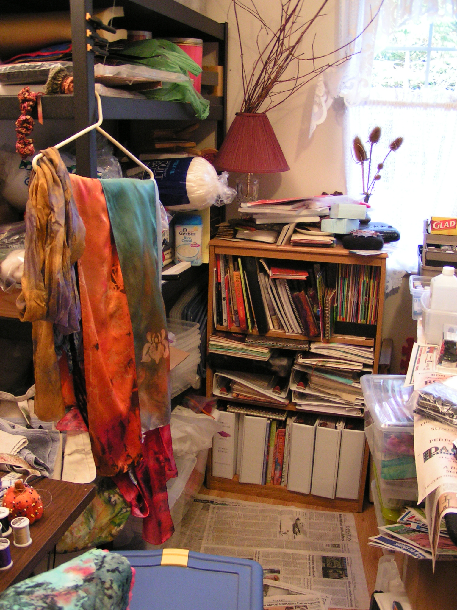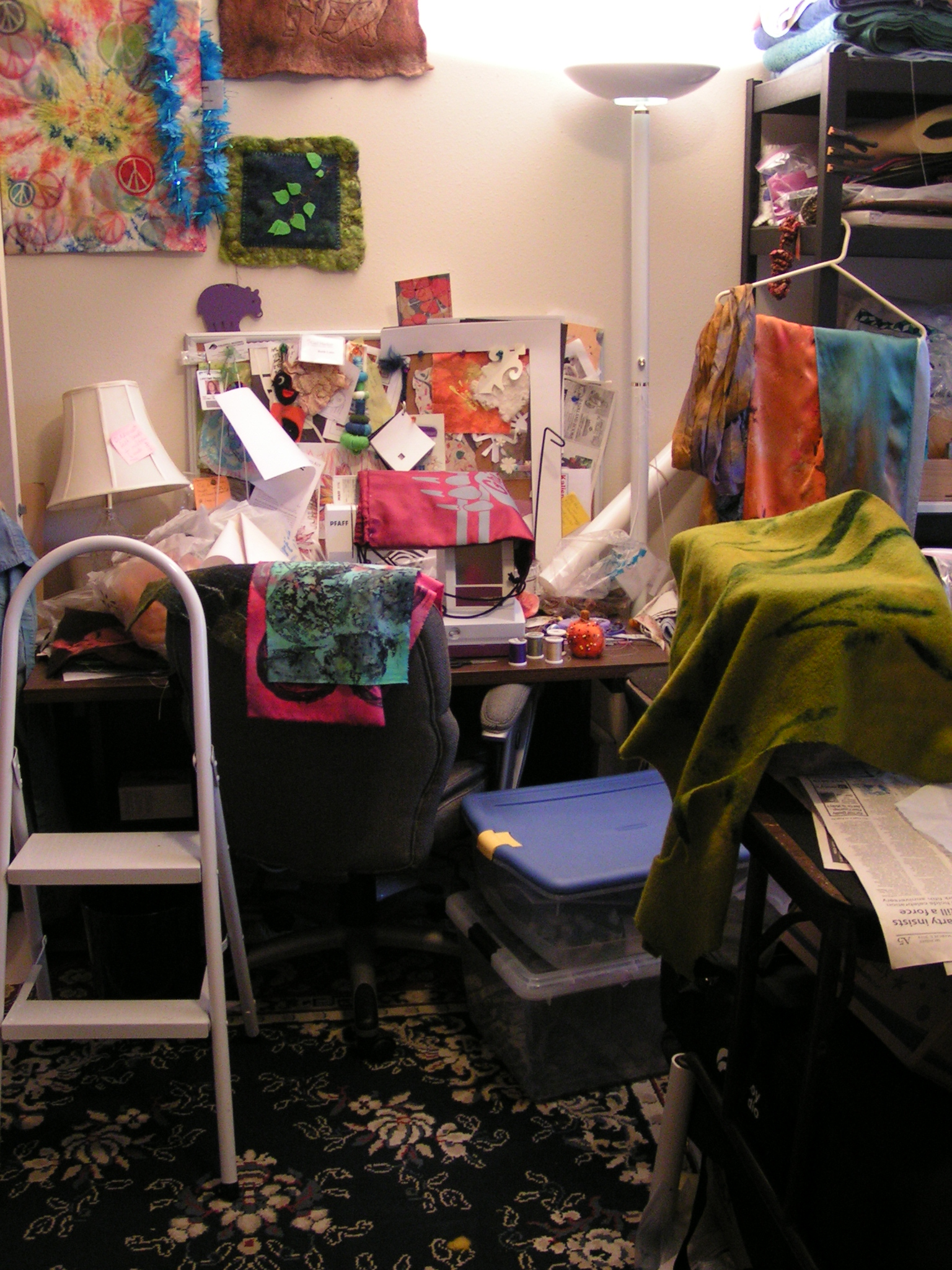 There is a thread that was started on the Felting and Fiber Studio forum showing everyone’s place where they create their work. So far, there have been really neat and tidy photos with everything in order and looking organized. I thought I would get my room cleaned up but so far it hasn’t happened. And since my room usually looks a mess, I thought I would post what mine looks like right now.