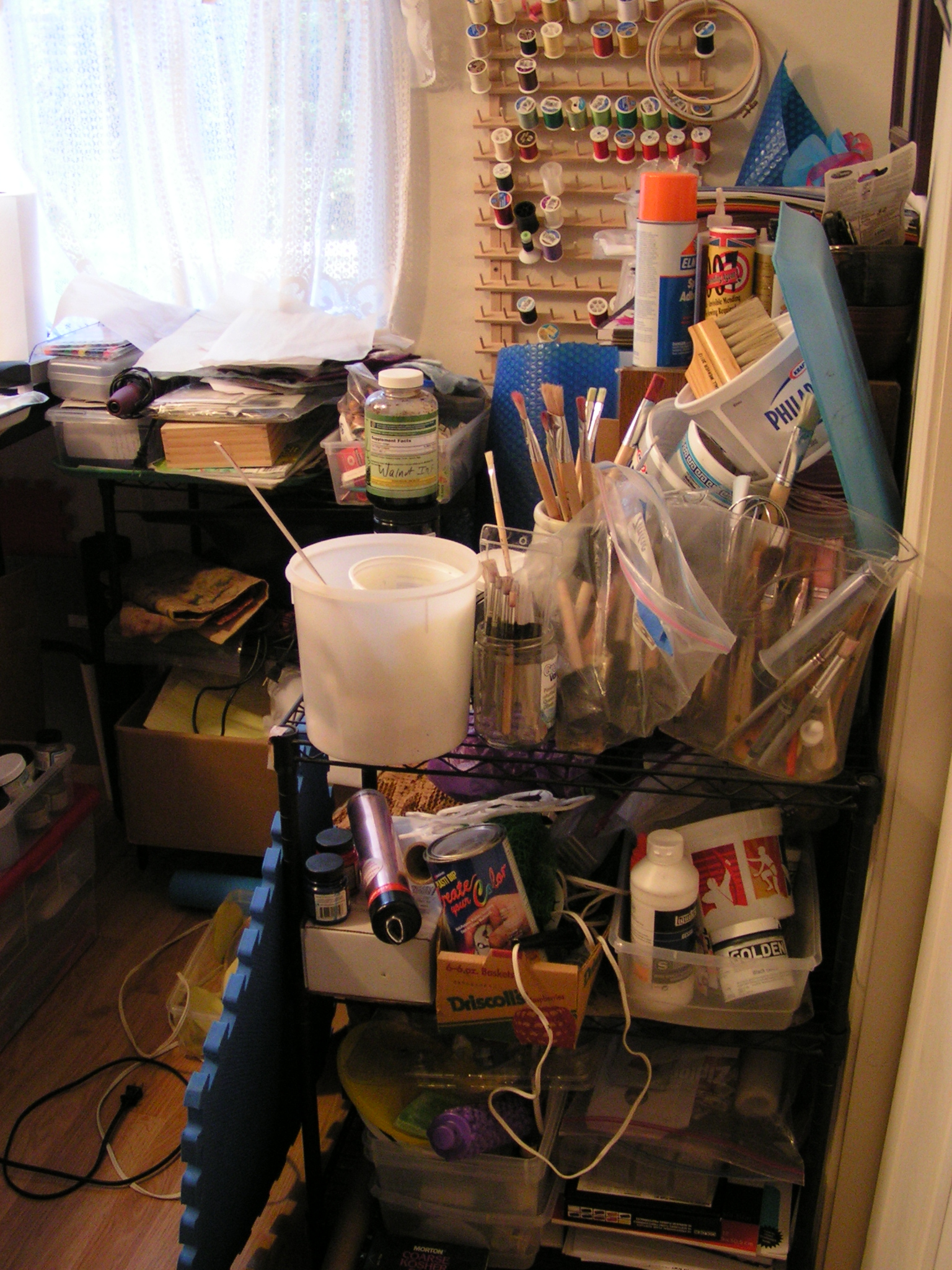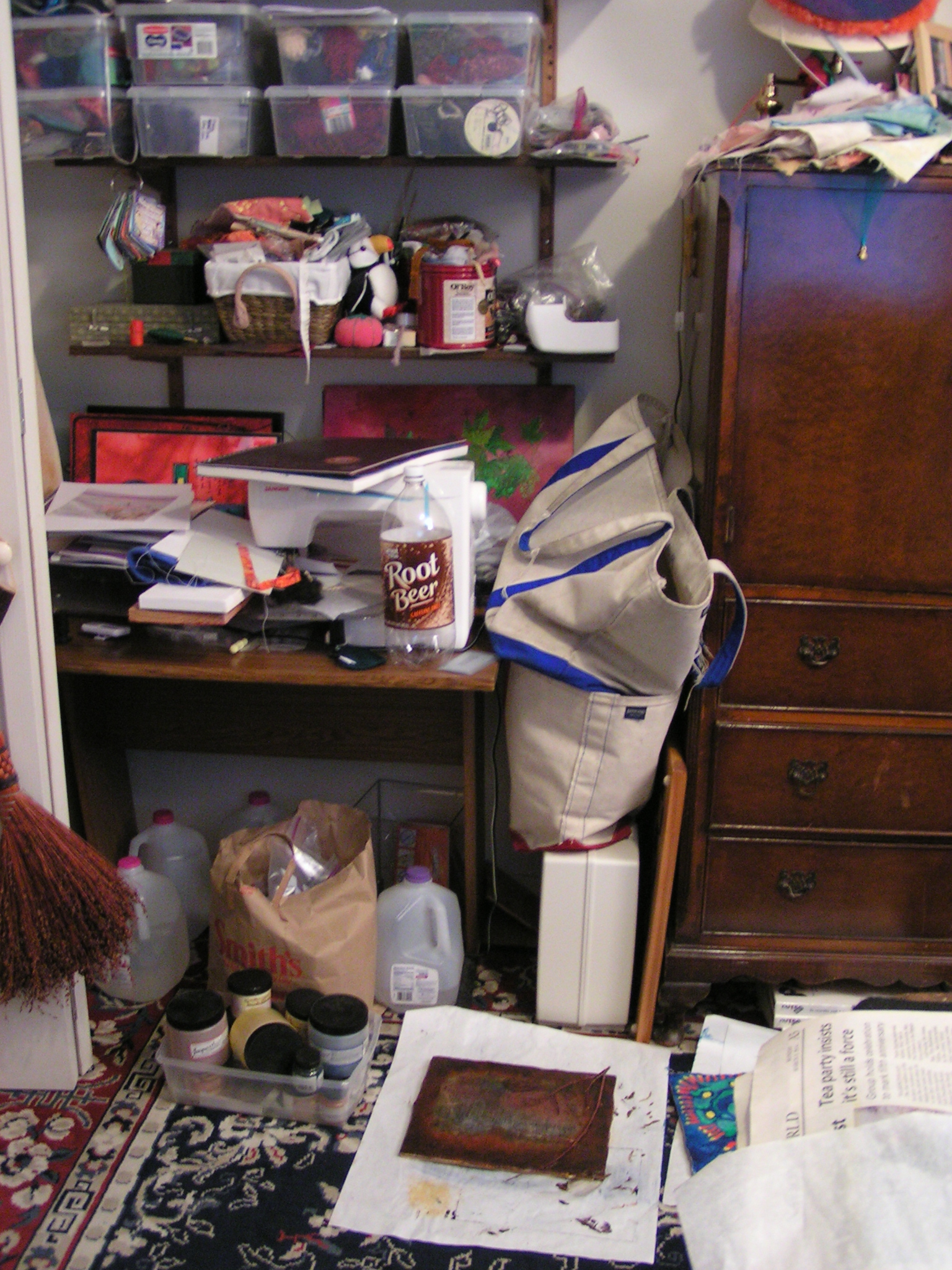 Lord Have Mercy. Ha ha. Hope there are no dead animals under there. I am a terrible neat freak. However, I have been in so many exhibits this summer that every room has artwork piled in it. I even sent some to the kids so I could find room. We all have these problems.