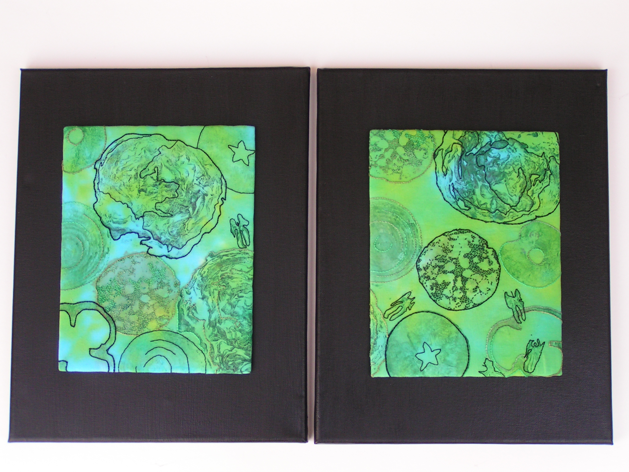 I hand stitched with green and black thread. The patterns were made with apples, pomegranates, cabbage, peppers and onions.