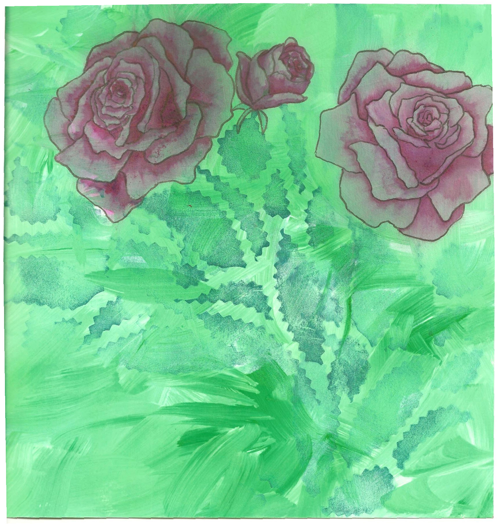 I have showed you this page before, it has a background of gesso and green paint, then it was stamped with the leaf shapes. I drew the roses with a pencil, then redrew in black pen. I then used Tombow pens to color and shade the roses. I am planning on adding stems to the roses and leaves so that all the stamped leaves will be background. I will post another photo when it’s finished.