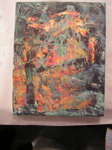 These are Sally’s canvases. She also used her extra paint on paper. The only one that might be finished is the far right one in the middle row.