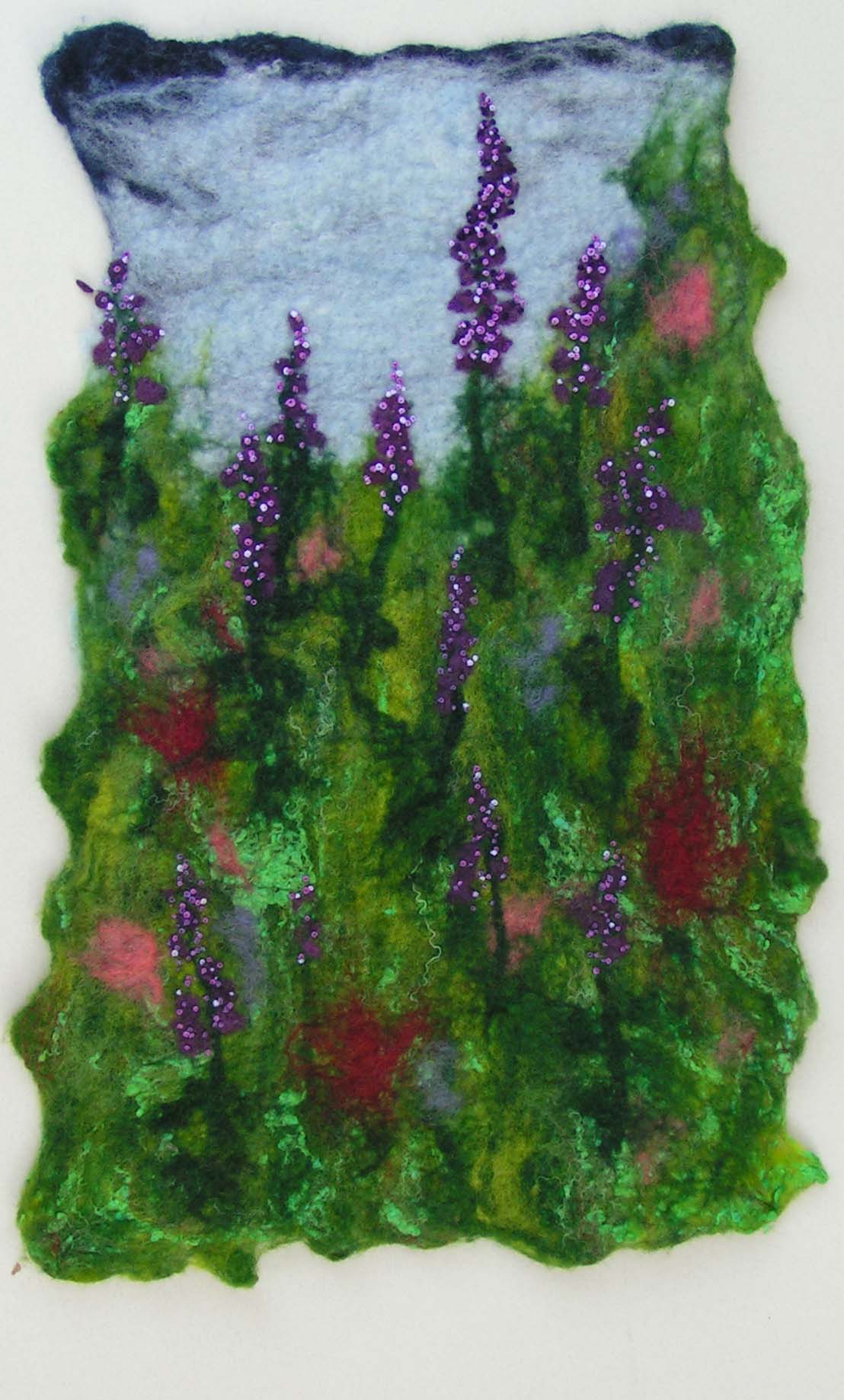 This is a close up of the last time I showed you the lupines. I had used a lot of very pale lavender french knots. They were just too stark a contrast and there were too many light ones.