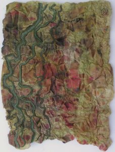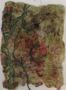 I have been gradually adding more couching to my nuno felted paper fabric laminated piece. (That’s a mouthful.)