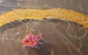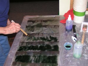 Here you can see Bunny and Louise adding dye to their fabric that had already had the soy wax applied. I am now waiting for the fabric to dry and then I have to iron the wax out of all the pieces. So I will have to show you the results later. We had a good time and I think I made some pretty ugly fabric somewhat better. But I guess we’ll see!