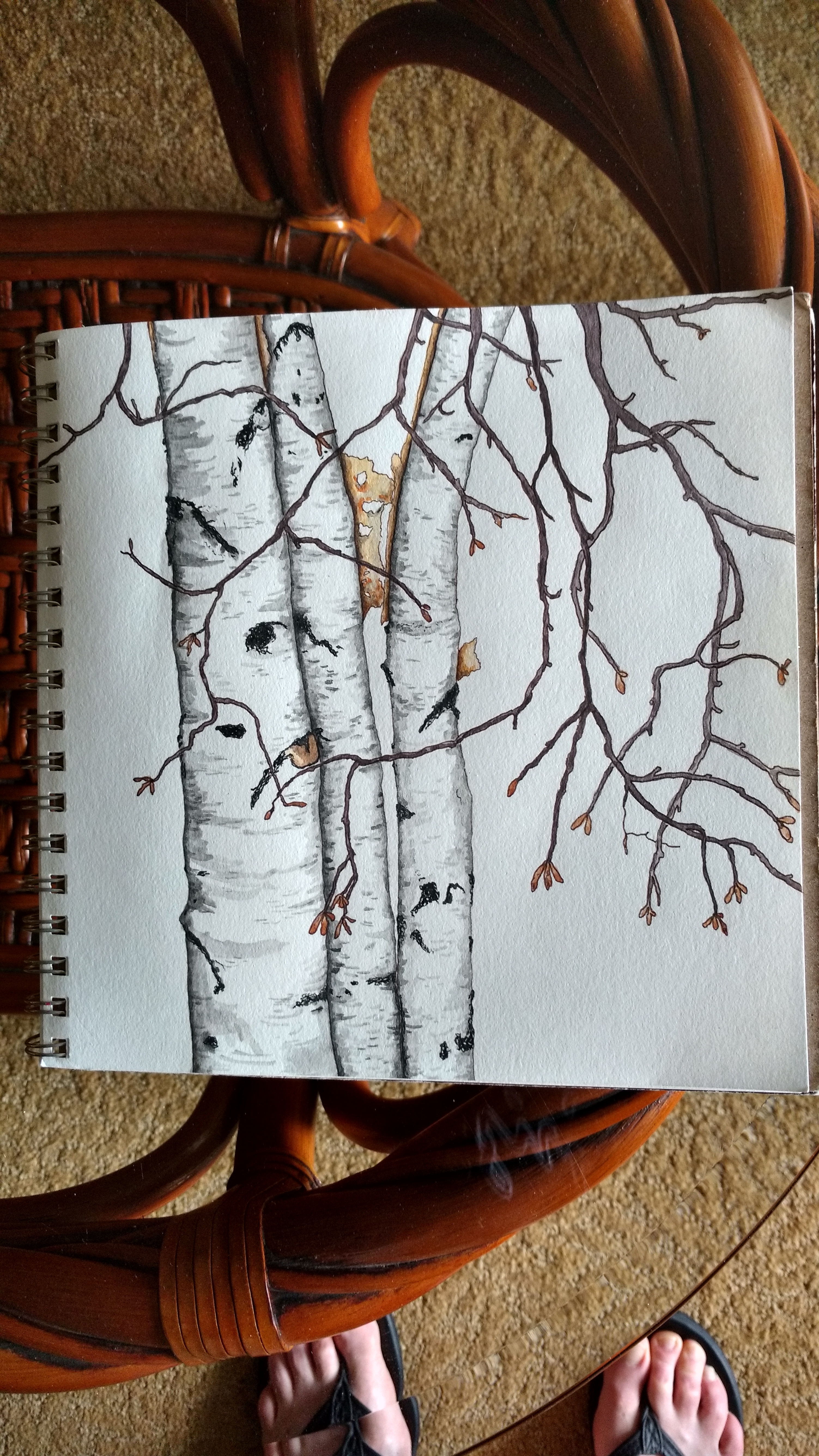 1. Difficult question. I do like the silver birch sketch just as it is – however, I have seen the trees against a bright, wintery, pale blue sky and they looked good.