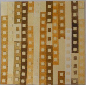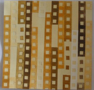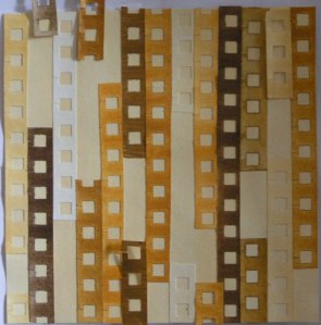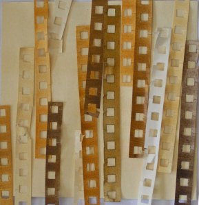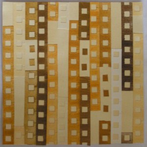I started gluing the strips down with a variety of light to dark values in my yellow oxide color.