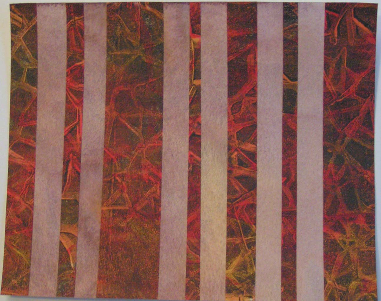 This one is created from a gelatin plate print that was cut into strips and applied to a painted background. I wasn’t thrilled with the print as it seemed a bit too busy. But I like it better as stripes on the calmer painted background.