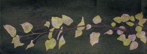 Then I decided to use one of my sketches of an aspen branch. I enlarged the design on the copier and then cut out a branch from purple paper. The skin I was going to use was green and purple so I thought a purple branch would be perfect. From a distance, it doesn’t even look purple now. Sorry for the quality of the photos, it’s getting really dark here early in the afternoon and this branch was really hard to photograph.