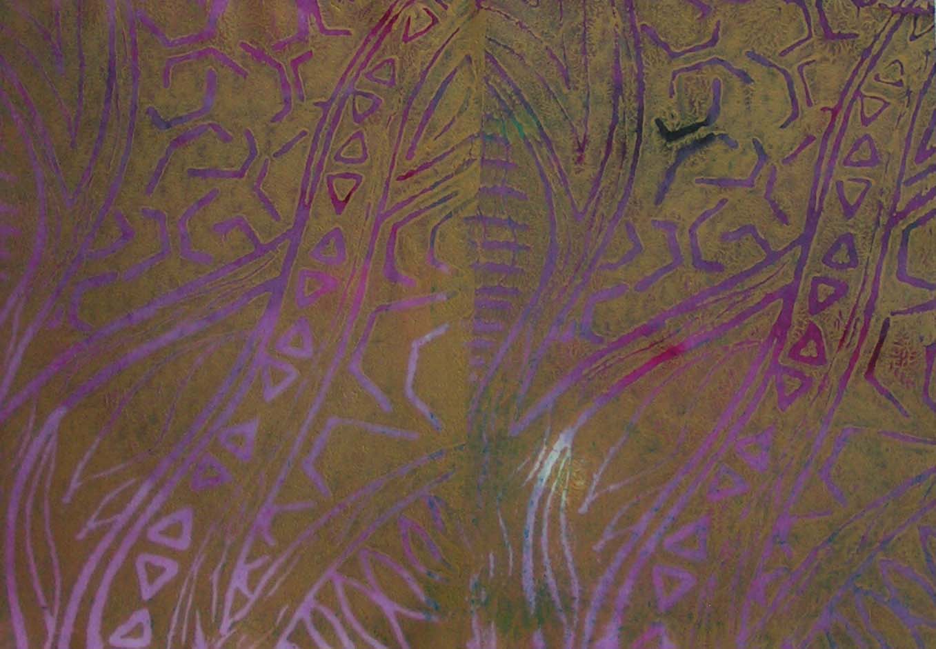 This one is gold ink over a mottled background with a texture stamp. Now I have to decide how I am going to extend or add to these prints as well as including them in collages. Lots of homework between now and March. I better get busy!