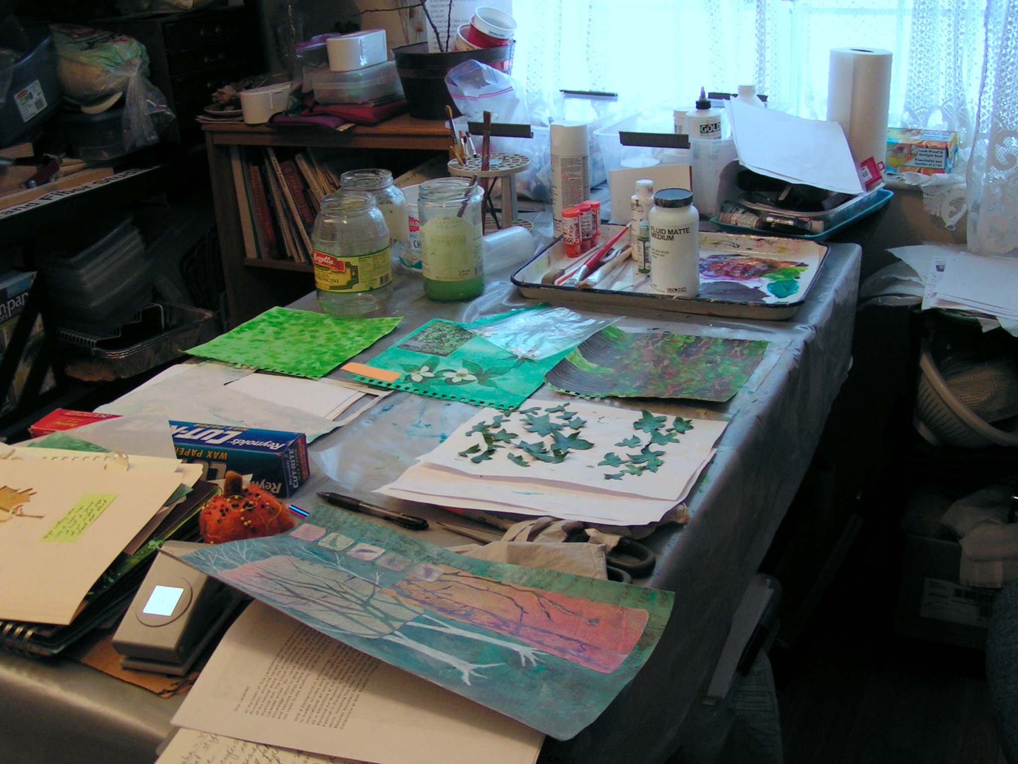 Here’s what the table looks like in my studio at the moment. This doesn’t show the piles of other projects in the works lying around in the rest of the house and by the sewing machine.