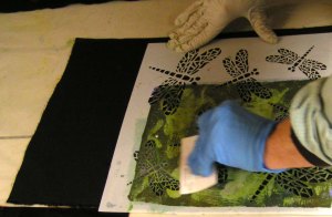 We used stencils and screens with thickened bleach and discharge paste as well. The silk scarf on the right is mine. It took forever to do and the results were so so. Not really worth the effort.