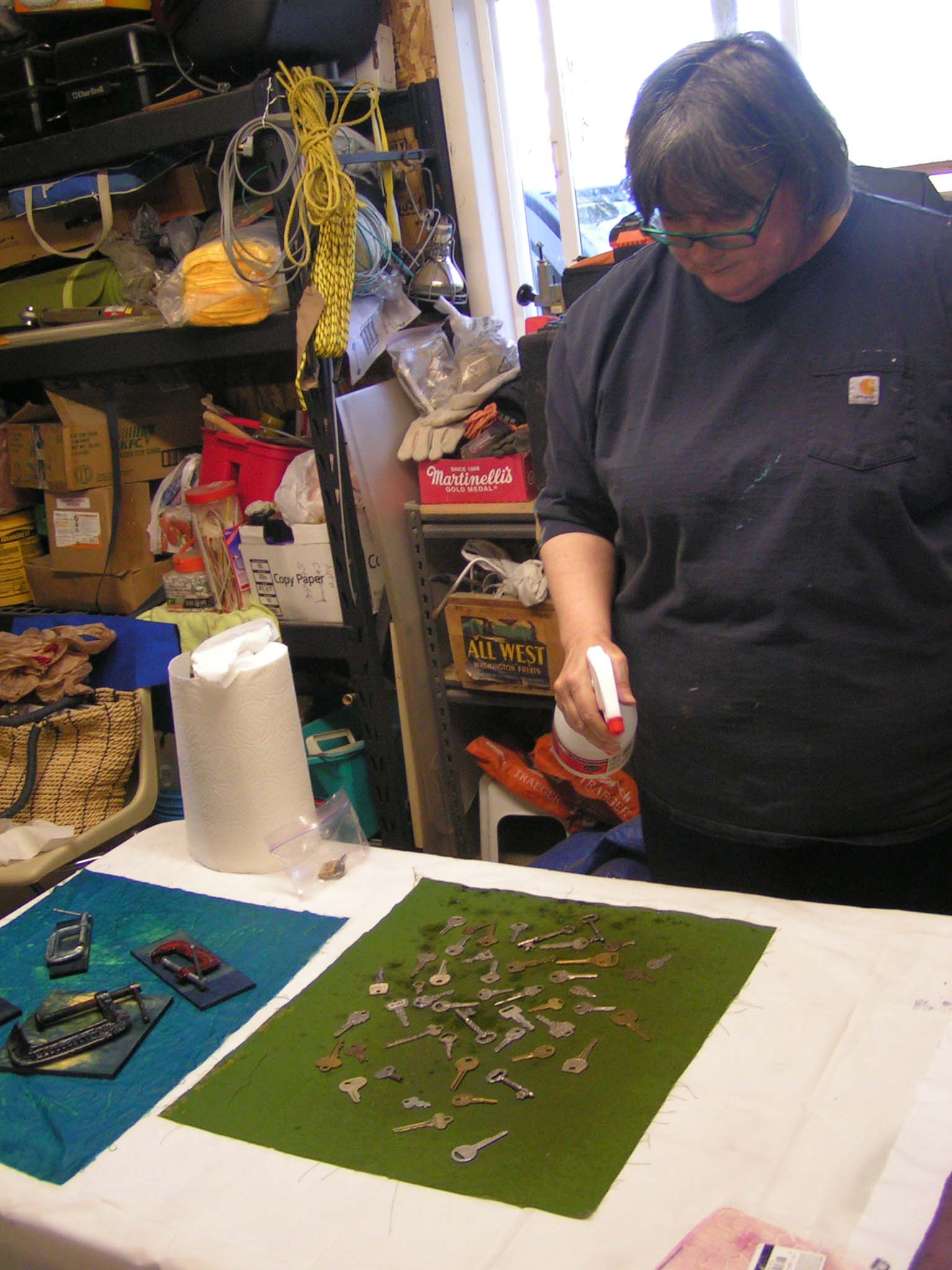 Here’s Deb spraying her green piece with the keys. After the pieces are bleached as much as you want, then you put them into a solution of Bleach Stop and water to soak. After that you rinse in clean water. Afterwards, it is best to wash the fabric in the washing machine. Hopefully, I will be able to show more of the results after our next meeting.