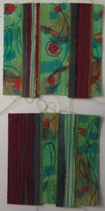 This is the red, blue green and yellow green color scheme. The piece on the left was free motion machine stitched and the one on the right with stripes is just regular straight stitch. Then the idea was to cut them up and put them back together. I decided to use two different pieces to give a bit more contrast.